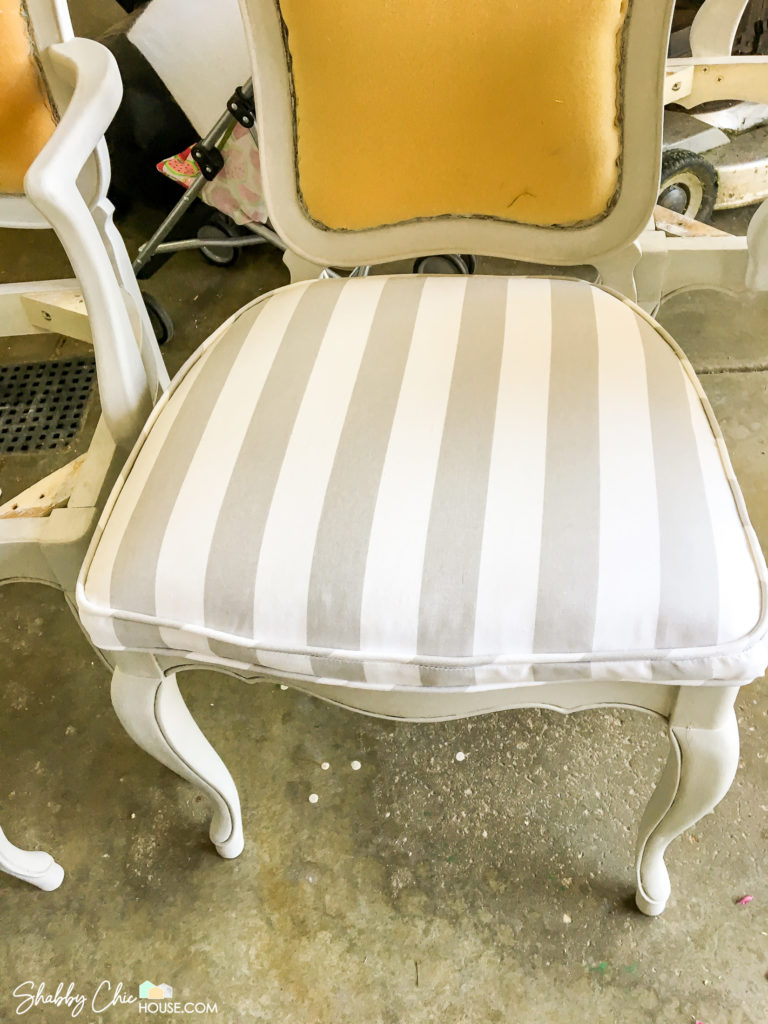 Following that failed experiment we decided just to reupholster all six of the chairs. We went with a polka dot pattern for the head/armed chairs and a thick striped pattern for the unarmed chairs.