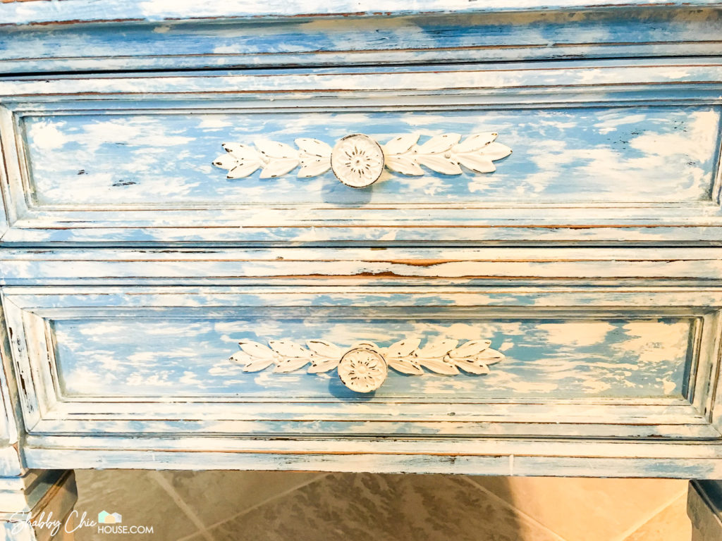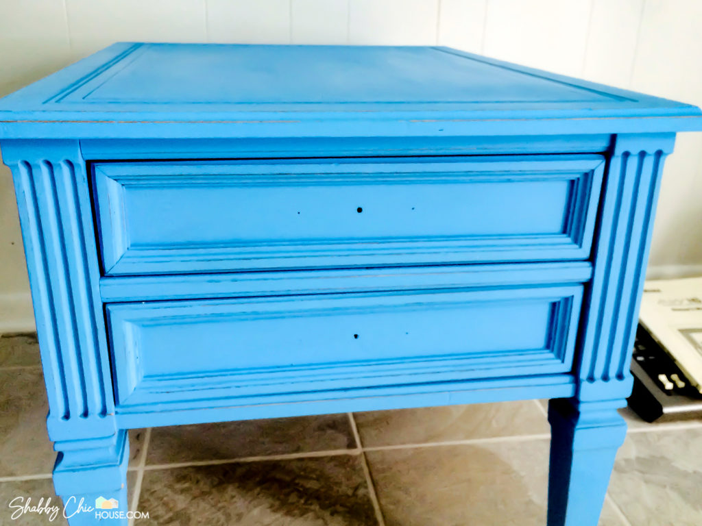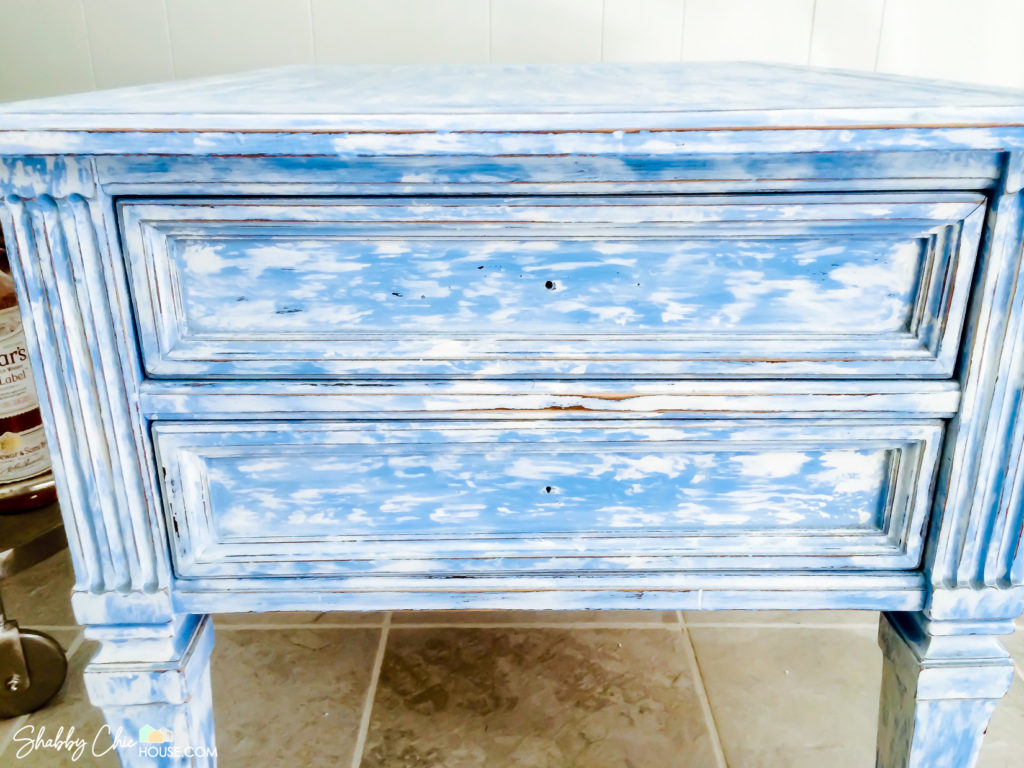 For this piece, I used electric blue homemade chalk paint for the base and a homemade white chalk paint for the topcoat. The best part about creating your own chalk paint is you can create colors not offered by the big chalk paint companies. If you missed it, check out How to Make your own chalk paint which was in my first blog post on How to Chalk Paint.