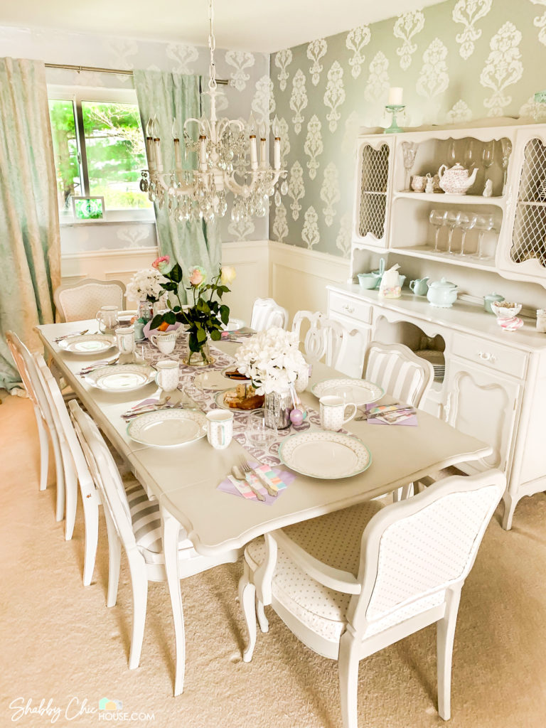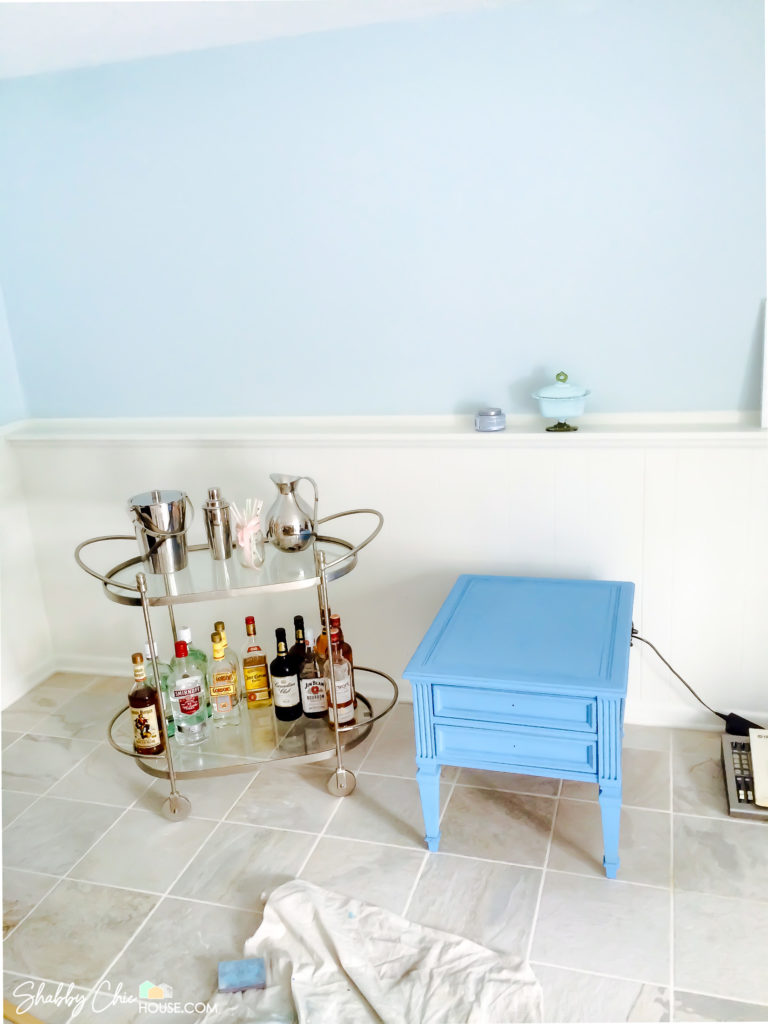We kicked off this project by painting the buffet and decided to use with Maison Blanche’s Silver Mink chalk paint. My wife loved the color and was looking to go with a complimentary color that match the white and silver damask wallpaper in the photo above.