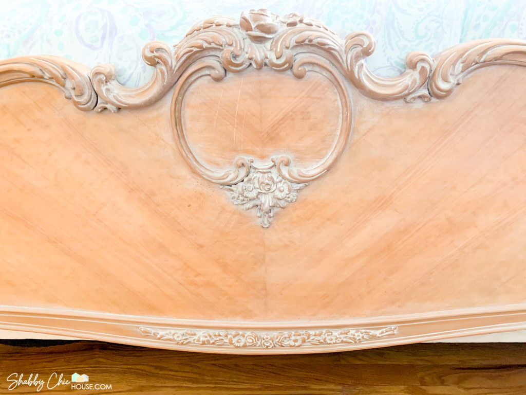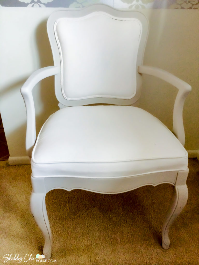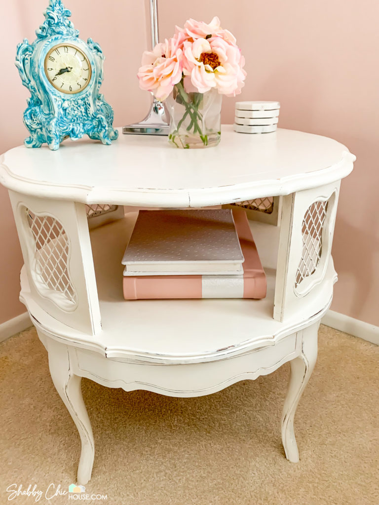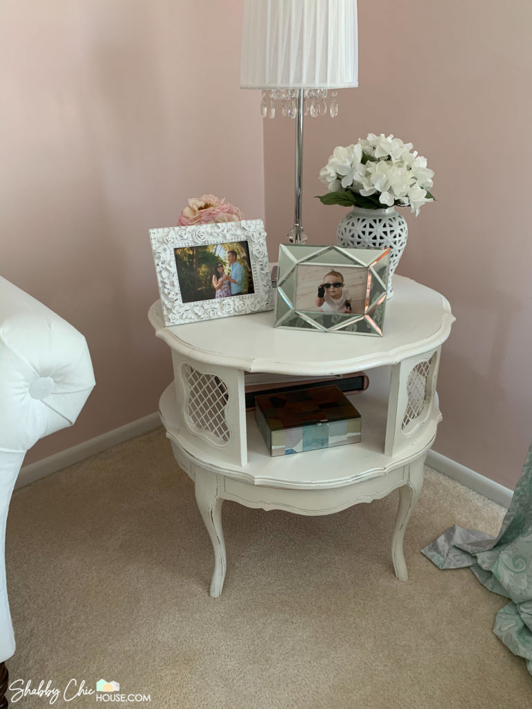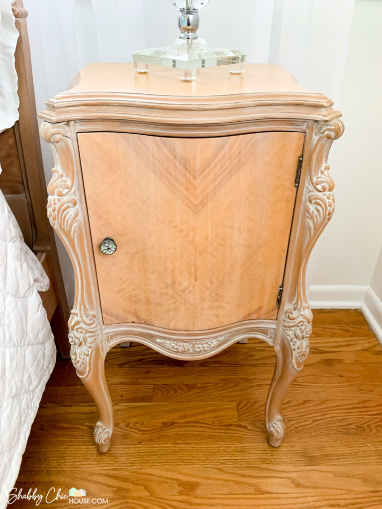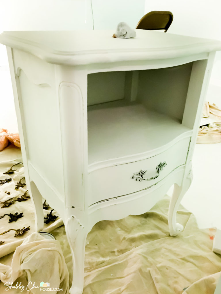 We wanted to use this end-table as part of a sitting area in our master bedroom, so we painted the top with Annie Sloan’s Pure White to coordinate with the three-piece French Provincial bedroom set you saw above.
