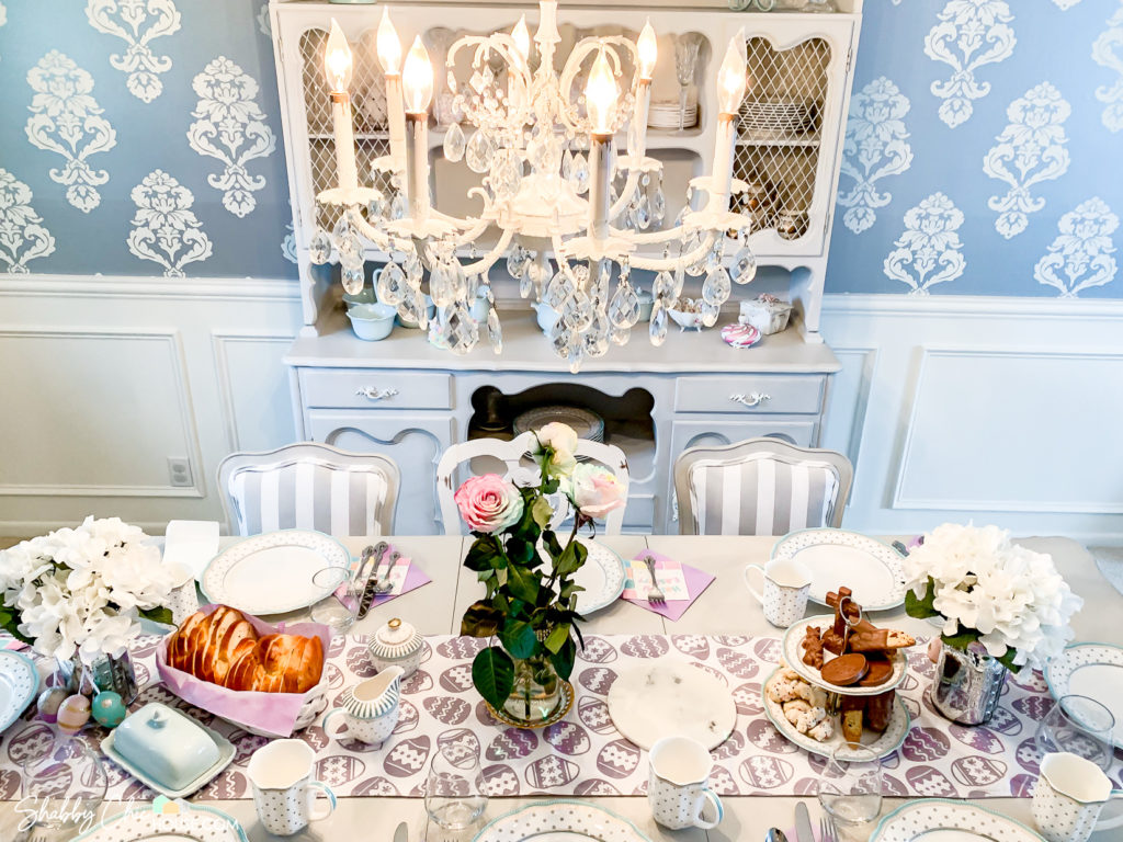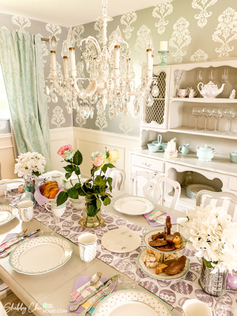 Also, you might have noticed the rest of the room throughout these photos. We finished the wainscoting and even chalk painted our old antique bronze chandelier white with chalk paint.