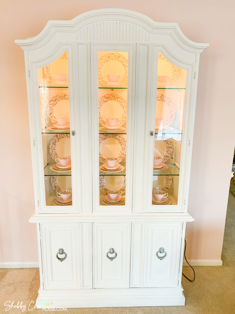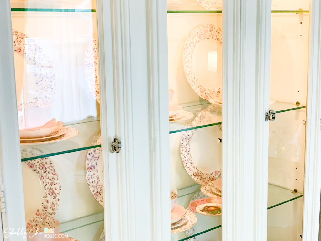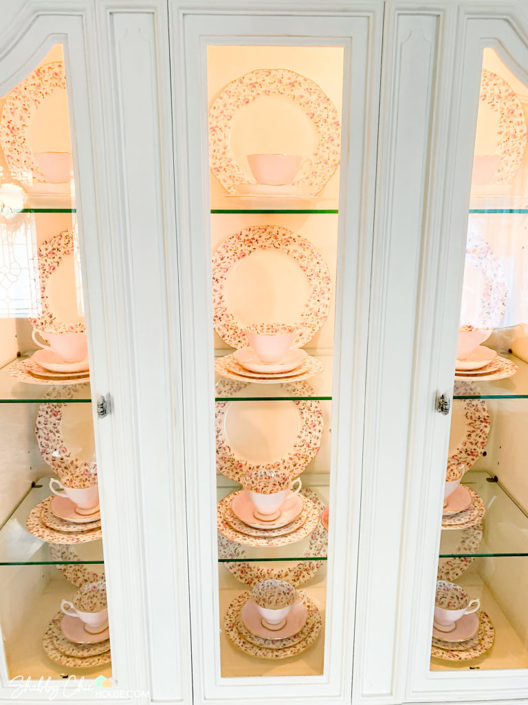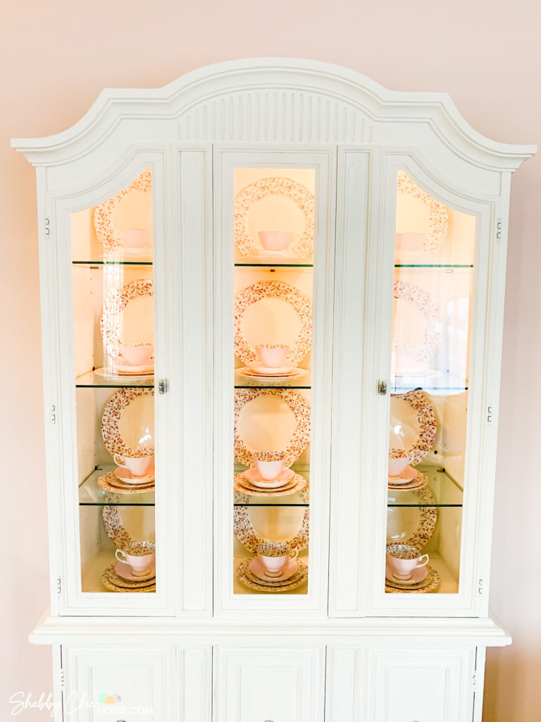 We loved this china cabinet as it had a light to show off our pieces, and the coolest part the glass shelves had a groove in them allowing us to stand up and display the gorgeous Royal Albert Rose Confetti china set my grandmother bought for us for our wedding.