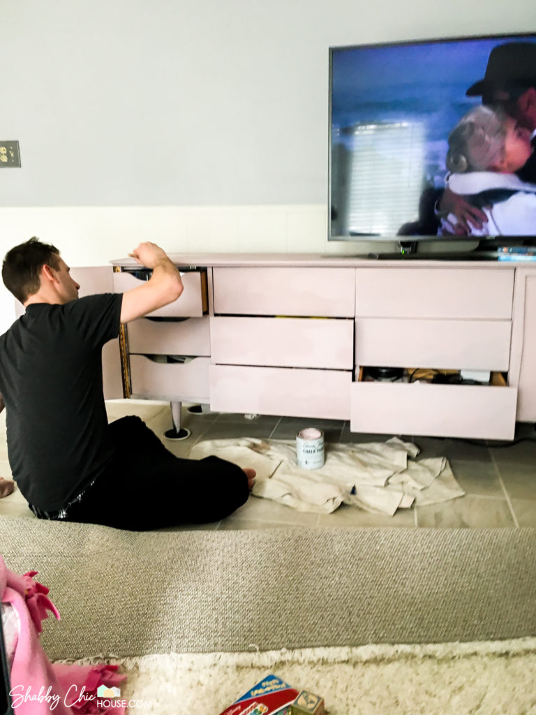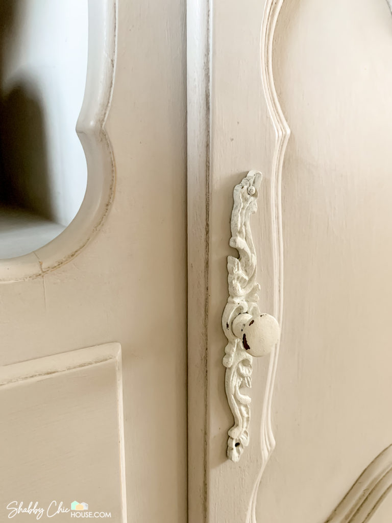 For the finishing touch we painted the old bronze hardware white and roughed up the edges to give the handles that aged look.
